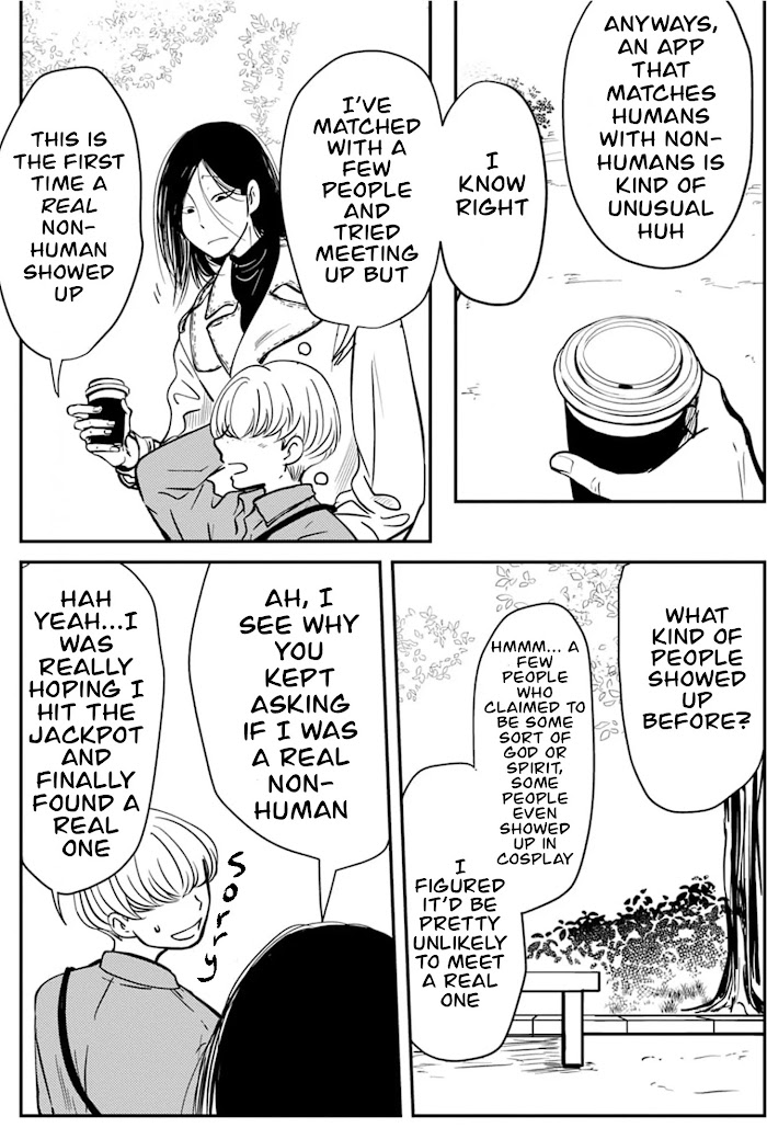 [A non-human with many "big" traits a human who loves non-humans]Kiyotaki, who's looking for a lover, decides to meet someone through a dating app that is rumored to let you meet non-humans! The person who shows up to their first date is a very tall, long-tongued, and incredibly charismatic non-human Morebito! Fascinated by non-humans, Kiyotaki becomes closer with Morebito as their relationship gets more intimate