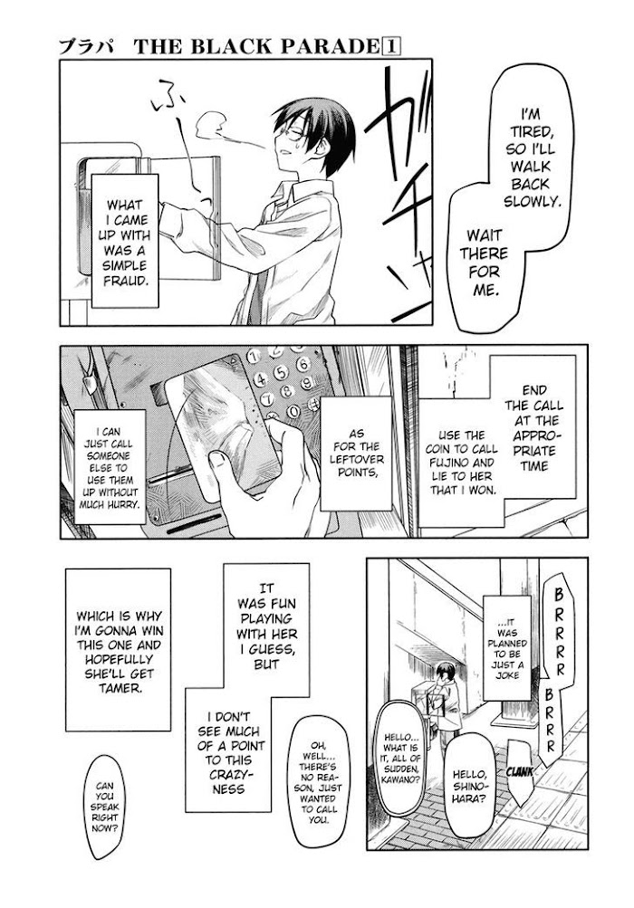 One day, a high school boy named Rumi comes across an abandoned, decommissioned tram car, a place that could make a neat 'secret base.' He also meets the wildly energetic Fujino, who challenges him to a duel over usage of the space. Their duel is actually a very creative, competitive game played out in the public areas of the town. While Rumi almost can't believe what's happening, he has to admit that their 'duel' is the most fun and excitement he's had in a long time, much more exciting than his video games. Before long, Rumi and Fujino are friends, and their adventures with the abandoned tram car, soon named the "Black Parade," have begun! (Source: MU)
