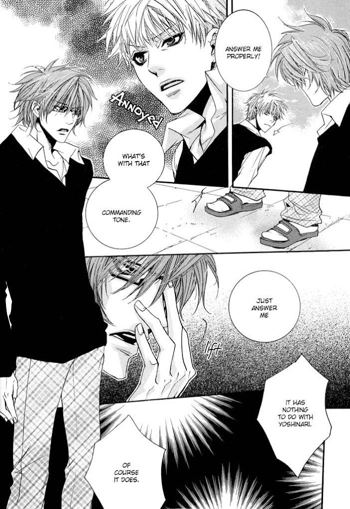 1. Ikenie Dim-bulb Suga is proud of his super smart boyfriend Yoshinari. But will a smarter Suga bring them closer together, or drive them further apart? 2. Derikisu Suga is always impressed by Yoshinari's calm face. But beneath the surface Yoshinari's thoughts are far from calm. 3. Deriketo ni Kisu Shite When Suga realizes he's both shorter and heavier than Yoshinari, he's surprised. It's true their love life has slowed down lately. Can Suga diet the magic back into their relationship? (Source: M-U)