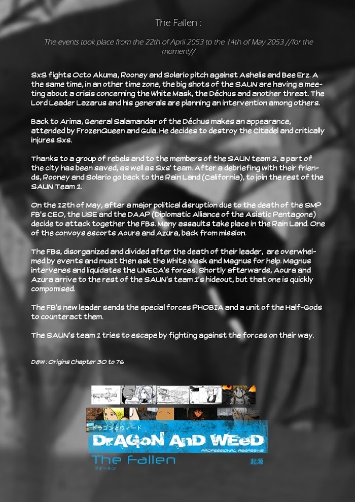Dragon and Weed: Origins - The Fallen manga summary: In 2053, two weeks after OutBreak, Dragon and Weed are now parties to the SAUN. They are traveling on a ship with old and new allies on a mission to locate the terrorist called "White Mask". They will soon be facing new enemies: The Fallen. Season 1:> Dragon and Weed: Origins - OutBreak(http://mangapark.com/search?q=sp/dragon-and-weed-origins-outbreak)