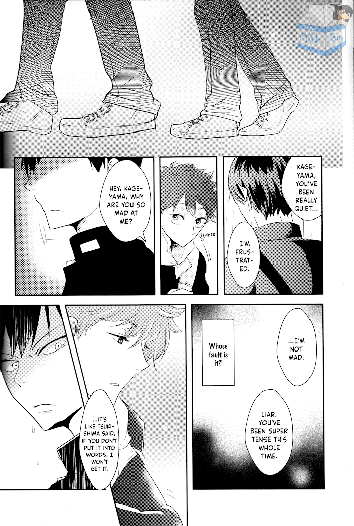 Two stories in one doujinshi! The first is about a classmate's comment making our KageHina duo curious about each other. However, instead of asking each other, they ask their teammates. Slight one-sided TsukkiHina. The 2nd story is a short blurb where Hinata gets injured and a well-meaning Kageyama puts the idea in Hinata's head that if he doesn't take care of himself, an evil spirit will get him!