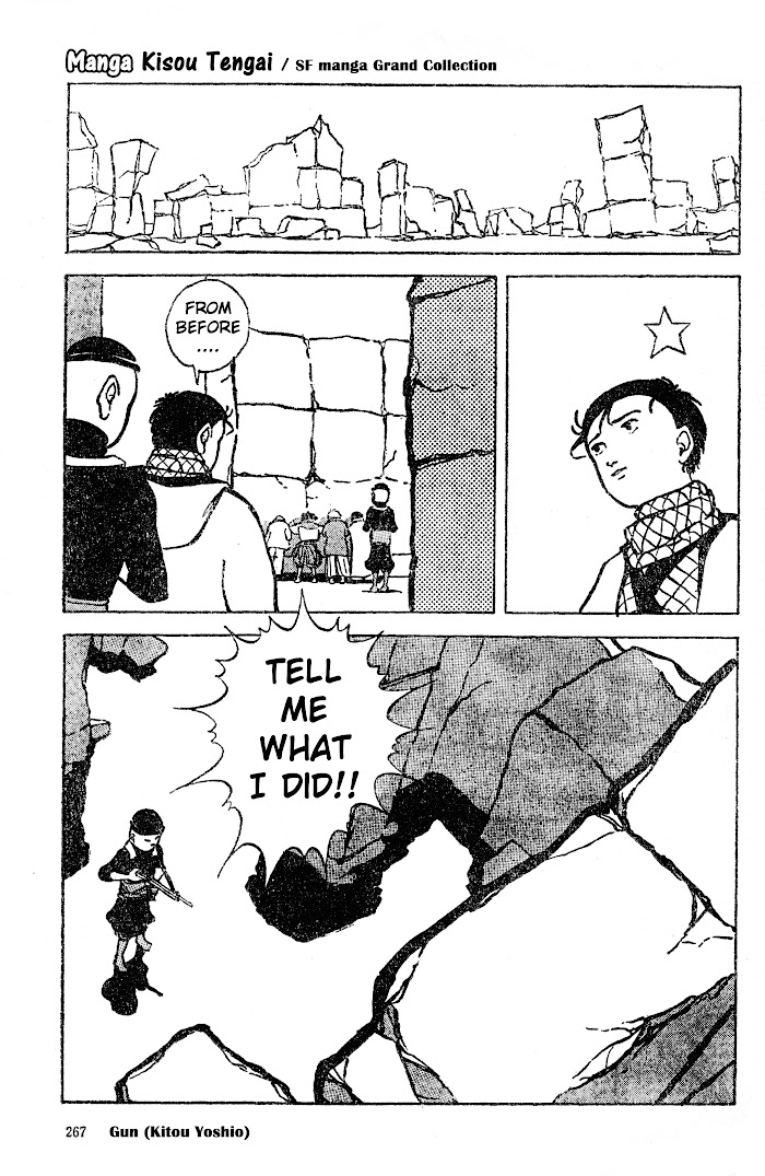 Juu manga summary: A lone wanderer travels through the desert to reach a distant city. Along the way he is tested by a mysterious stranger who offers him a gun... A oneshot from Manga Kisou Tengai volume 8.