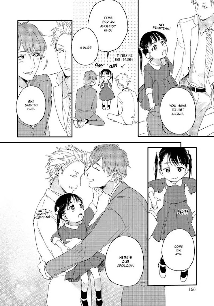 The kind, smitten Chiaki and the scary yet reliable Kazuma are a long-term gay couple. Tomoe, the tomboy who knows of their relationship, asks to see them, and they find her with a large tummy and another life growing inside her. The father is unknown, and although Chiaki and Kazuma are exasperated with the chipper Tomoe, they help her out. Before they know it, the baby is born. The two men are relieved that Tomoe is acting like a proper mother, but one day, Tomoe comes to them with tears in her eyes and says, "Take care of her for me.......!" (Source: Renta!)