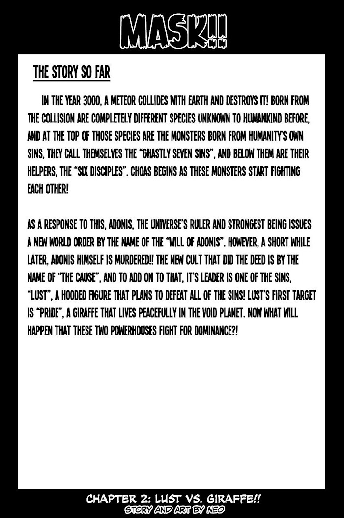 Mask!!(SKY) manga summary: In the year 3000, a meteor strikes earth and destroys it! Terfiying beasts born from Humanity's Sins now take over the universe. These monsters are called the "Ghastly Seven Sins"!! Meanwhile, at the center of the universe, Adonis, the ruler of the universe, and it's strongest being is destroyed! What in the world is going on?!