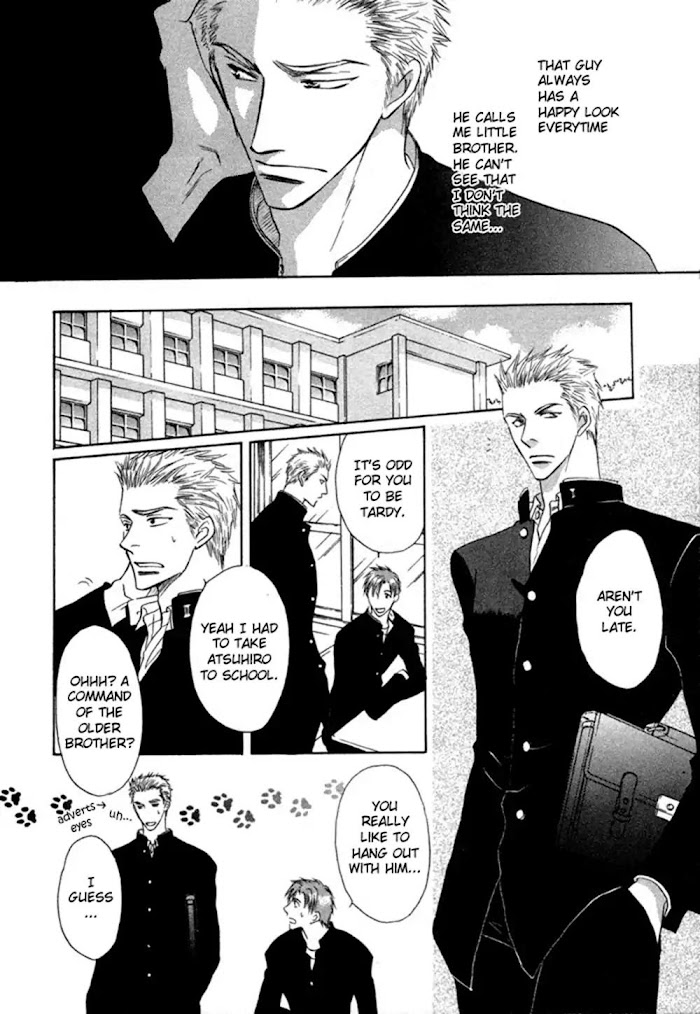 Series of oneshots : 1) The Memory of Water (Mizu no Kioku)- Shiina is an ex-swimmer who is now a chain-smoking high school teacher. He's tried to leave his swimming past behind him, but upright student Kadokura won't let that happen. 2) Forecast of Life's Springtime- Minori is the son of professional gardeners and he's sick to death of flowers! Gardening club student Shoutarou kills everything he touches, and Minori feels sorry for him. 3) A Child's Belongings (Kodomo no Mochimono)- Hiroto's parents died in an accident and then he is approached by a businessman who wants to buy him. But he's not interested in sex, he just likes to look at Hiroto in his school uniform. 4) Sweet Home, Bitter Brother- Atsuhiro and Yousuke were childhood friends who became brothers at a young age. They've always been together with the slightly older Atsuhiro leading Yousuke. But Yousuke's has feeling he can't tell his "brother" and resolves to go away to college. 5) Paradise Game- Hazuki Junya is a professional gamer who works for a video game company, but when he gets beaten by his new coworker and amatuer Hatanaki Ryouji he can't believe it. A friendly rivalry and friendship starts between the two. (from B-U)