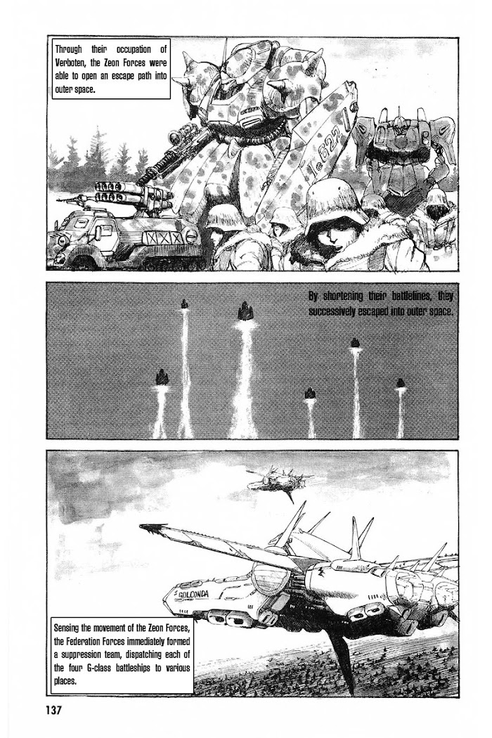 Taking place in the interlude between Gundam ZZ and Char's Counterattack, Kazuhisa Kondoh's dynamic manga of continuing Zeon rebellion against the Federation showcases the continuing struggle of former Zeon OYW cadet Frederick Brown. Currently a Lieutenant in the Zeon Forces, he leads several ragtag supporters on a seemingly impossible counterattack against the Earth Federation Forces. [synopsis by Zeonic Corps]