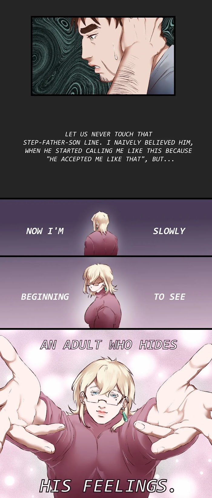 "My Tiny Family" is a complicated story of a small family consisted of a stepfather, a stepson, and a little half-brother. Teodor never saw Eliasz as his new father, but the birth of his younger brother and society forced him to accept it. Unfortunately, even then he was unable to enjoy life with both parents. After his mother's death, he had to learn to live for his stepfather and brother. Living under the same roof, Teo finally admits to the feelings he has been suppressing for years, which begins to change Elias's perception of him. They both want to keep it hidden from the world, from Marcel, who is unaware of anything.I hope you enjoy reading this story and finding out what happens at the end of the comic!+