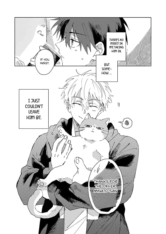 For Minato, a corporate slave neglecting his health, the only thing that heals him is feeding the local tomcat, Nyako. As much as Minato would like to take Nyako home with him, even heβs aware of his irregular lifestyle and how unfair it would be to the cat to do so. During his routine night feeding for Nyako, Minato happens upon an unconscious man named Ritsu laying in a garbage dump. Without anywhere to go and unable to leave him alone, Minato suggests Ritsu stay with him on the pretense that he helps take care of Nyako during the day.