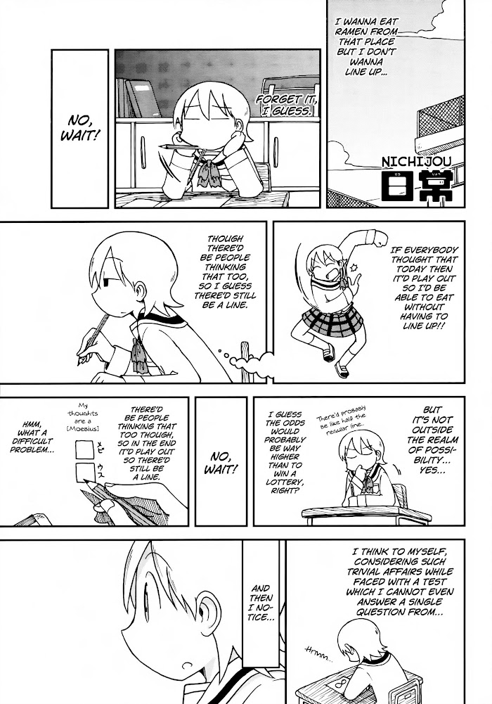 While the title suggests a story of simple, everyday school life, the contents are more the opposite. The setting is a strange school where you may see the principal wrestle a deer or a robot's arm hide a rollcake. However there are still normal stories, like making a card castle or taking a test you didn't study for. The art style is cute but mixes with extreme expressions and action sequences for surprising comedy bits. Included one-shot: Volume 2: Nichijou no Prototype (2 chapters)