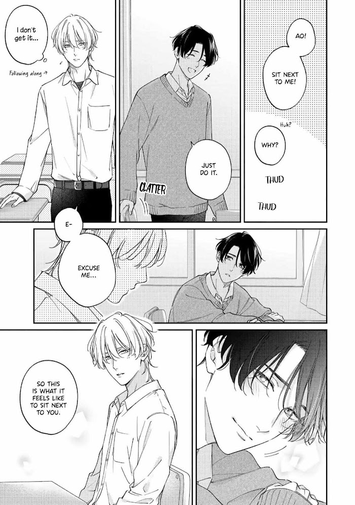 Ao, with a cool and kind personality, is known as the most handsome prince in school. His childhood friend Haru, is one year older than him. However, Ao, who's secretly in love with Haru, feels lonely because they're in different grades. Meanwhile, summer vacation begins, and when the two boys are curious about a kissing scene they see on TV; Haru suddenly blurts out, "I wonder what kissing feels like?''... Their relationship begins to change.