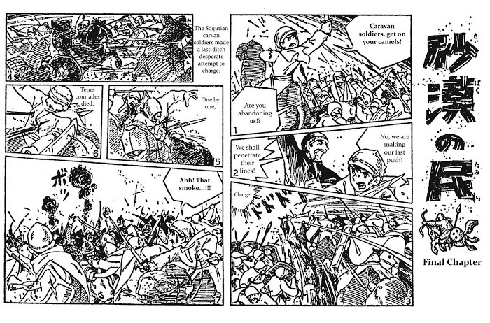 Is a manga which Miyazaki wrote for a newspaper targeted for children. It is more of a graphic novel than a manga, since most of the text are written outside of the frames and there are very few dialogue bubbles (though towards the end of the story, it moved closer to the traditional manga style). The surprisingly dark story deals with the devastation of war, betrayal, and the ugliness of the human nature under desperate situations, including deaths of several characters. One can see the influence of Tezuka Osamu in the art style of this manga (as in most of the manga written in this time), but you can also clearly see the style and motives you find in Miyazaki's later works such as "Nausicaä." In a sense, this is a prototype of "Nausicaä."