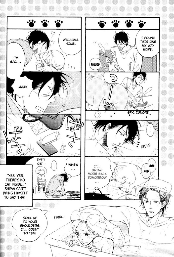 Love is found in the strangest places and with the most unexpected partners. The men (and cats!) of SENTIMENTAL GARDEN LOVER burst into heart-throbbing bloom! A scruffy stray cat wishes for big hands to hold an abused man, and a cute kitten begs for speech to comfort a broken-hearted stranger. Wander further into the garden, and you'll find close siblings upset by a love rival; a jaded delinquent flustered by a trusting bookworm; an evasive, glasses-hating man; and a president eager to find a weakness in his perfect secretary. For both cat and human, the quest for love is here! (Source: DMG)