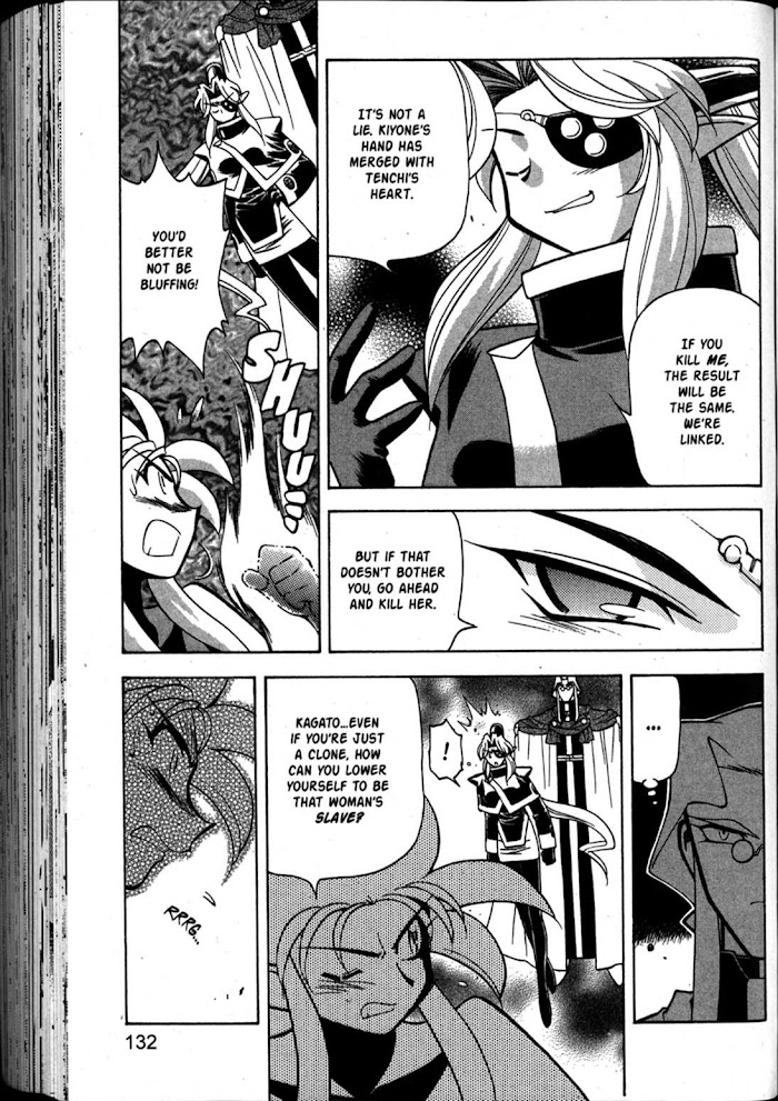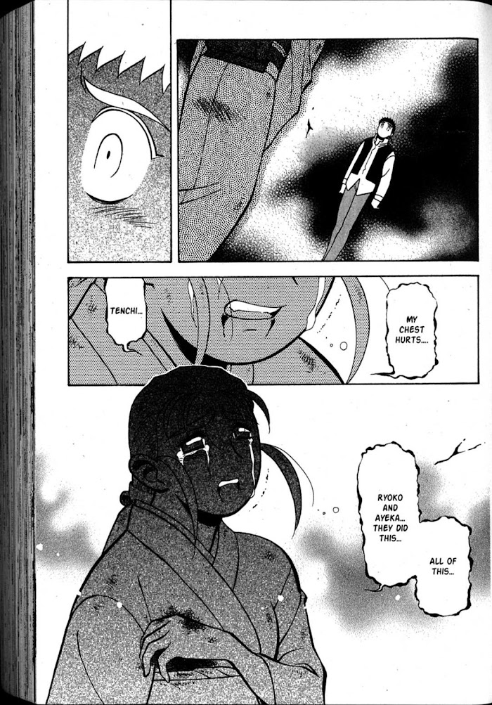Shin Tenchi Muyo manga summary: Tenchi Masaki is a shy high school boy, yet honest and hard working. He looks forward to living a basic humble life, taking over his grandfather's shrine. However, nothing is ever as simple as one would want, as Tenchi soon learns. A series of events beginning with the sudden appearance of Ryoko, the space pirate, creates madness in his home. Now he must figure out how to juggle 2 princess's, a space pirate, 2 galaxy police, the worlds most intelligent genius and a Rabbit-turned-Spaceship in his quiet country home.