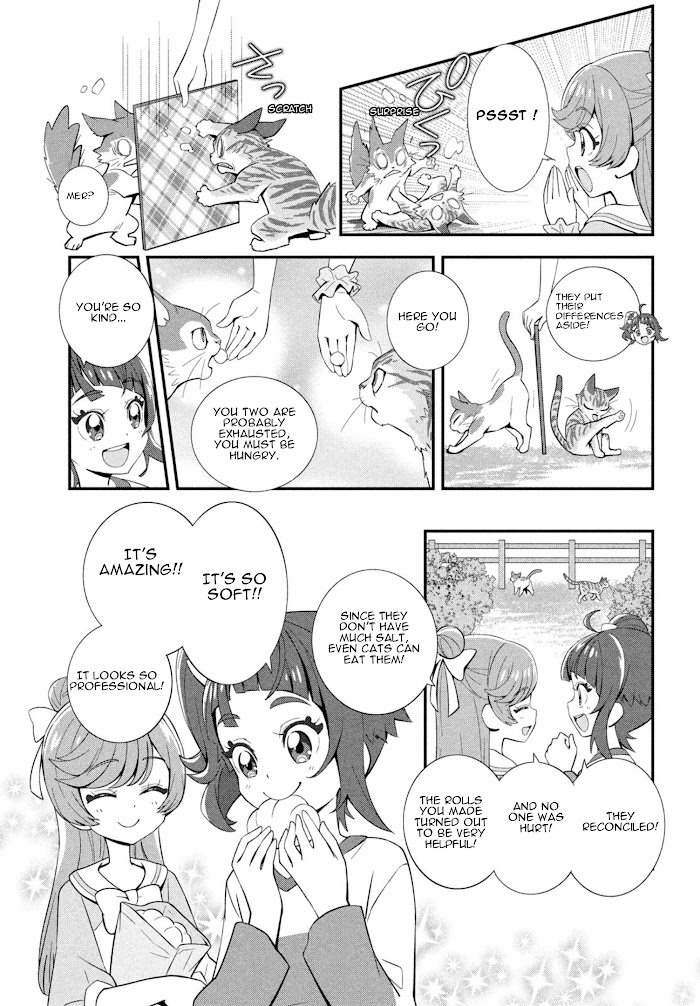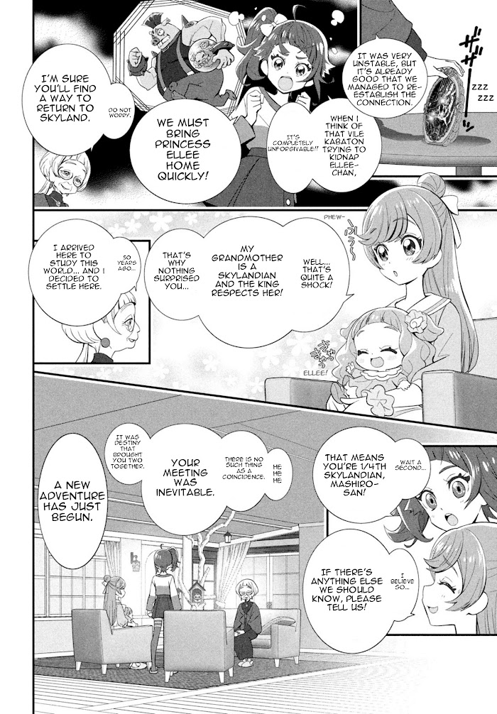 A major incident has occurred in the peaceful Skyland!?The young Princess Ellee has been kidnapped by the monsters of Underg Empire!A brave young girl, Sora, follows the princess through a mysterious hole."TV"? "Cars"? Are those some kind of magic tools!?!?But there's no time to be surprised! She has to get the princess back to the castle...!Flying between two worlds! The adventure with the Pretty Cure begins now!It's hero time!+