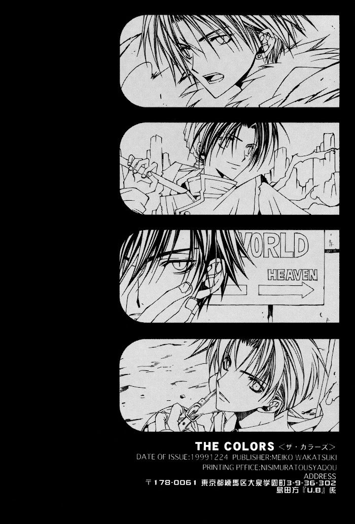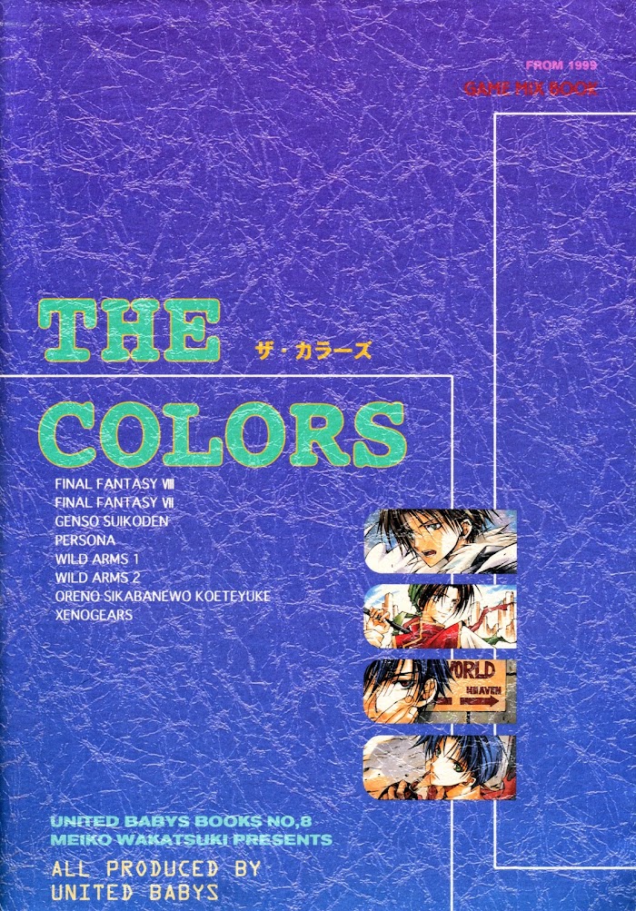 The Colors manga summary: A series of gags from several, uh, series. We've got school plays! Poisoning attempts! Failed recruiting attempts! Sibling affection (?!), over-protective siblings, and S&M. A little something for everyone.Series included:Final Fantasy VIIFinal Fantasy VIIIGensou SuikodenOre no Shikabane wo Koete YukePersonaWild ARMsWild ARMs 2Xenogears
