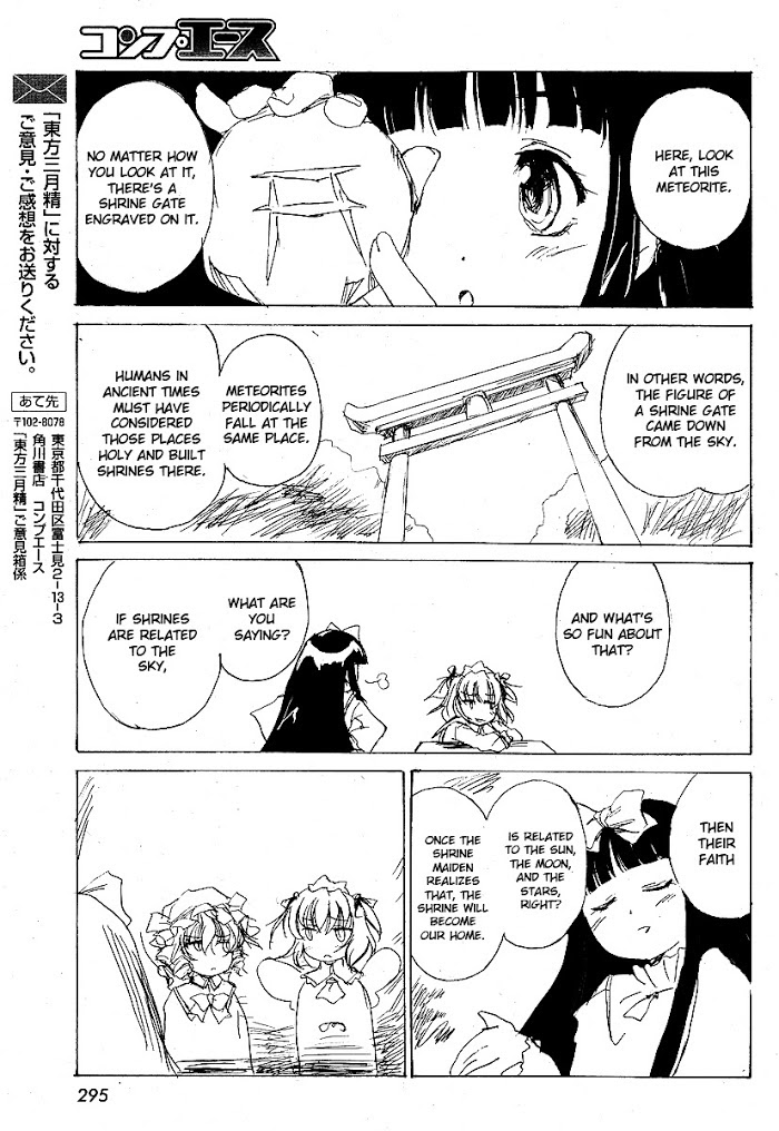 This manga takes place in Gensokyou, the setting for most of the Touhou games. It's the story of 3 fairies and their daily tricking to visitors of Hakurei Shrine, getting revenged, and so on.